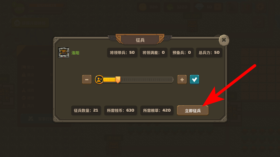 4、在征兵的界面,需要调整好征兵数量后,点击立即征兵,消耗对应金币获取兵力,充足的兵力能支撑后续的出征作战或城池防御,助力你推进策略扩张进程。