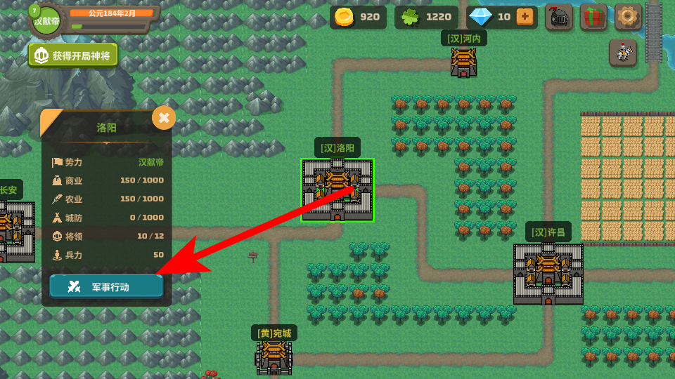 2、进入领地场景后,点击己方城池触发操作界面,选择军事行动,这是管理城池军事的关键操作,通过该界面可解锁征兵等军事功能,为后续的领地争夺铺垫基础。