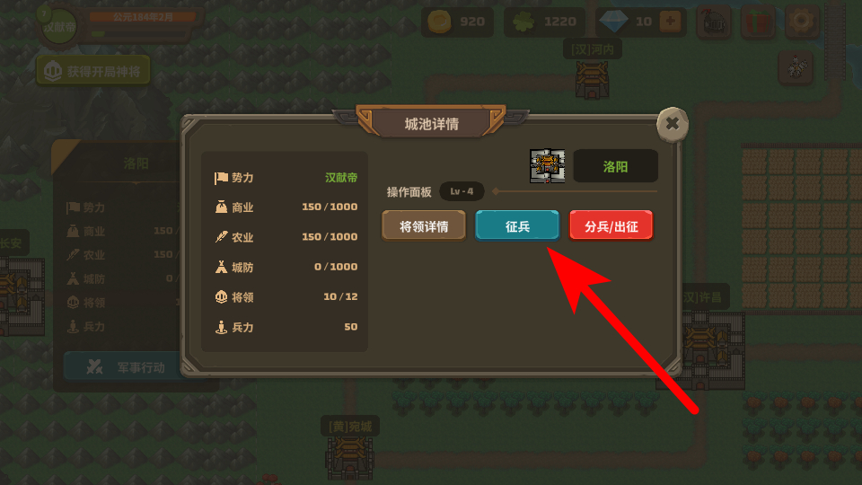 3、在城池详情界面中,点击征兵按钮进入征兵界面,这是扩充兵力的核心操作,兵力是城池防御、领地扩张的核心资源,开启征兵是提升军事力量的首要步骤。