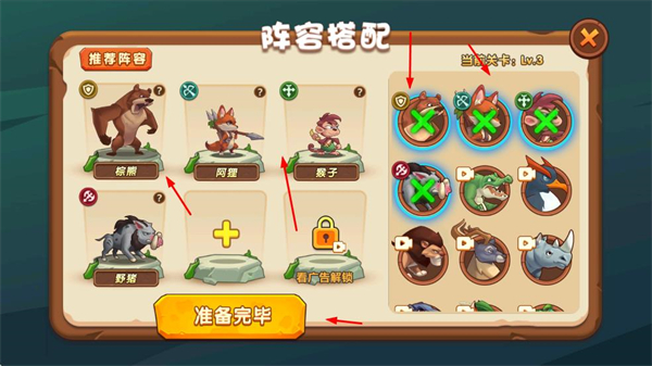 1、在阵容搭配界面,选择推荐的己方单位组成出战阵容,点击准备完毕确认配置,进入对战关卡。