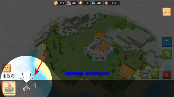 2、关注箭头指引的建筑区域,点击可进行建筑的建设或升级,如城堡区域,通过建设建筑完善岛屿的设施,提升岛屿的功能等级。