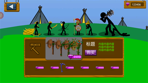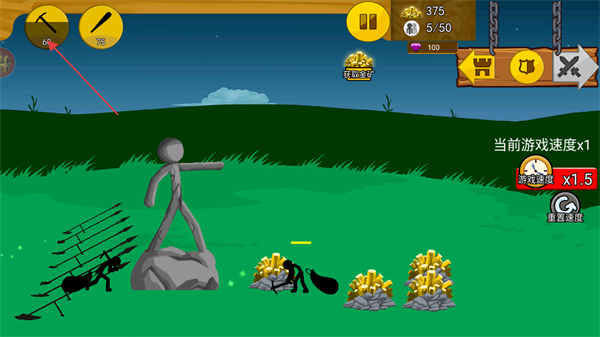 2、点击左上角的按钮可以花费金币召唤出阵营的火柴人,进行挖矿和进攻等操作。