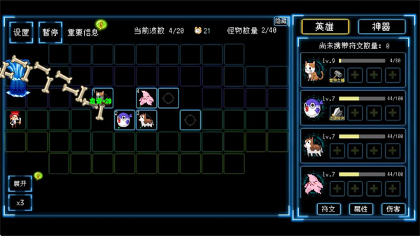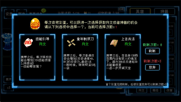 3、战斗间隙可选择符文/神器,配置增益道具,增强英雄的战斗能力,提升关卡通关效率。