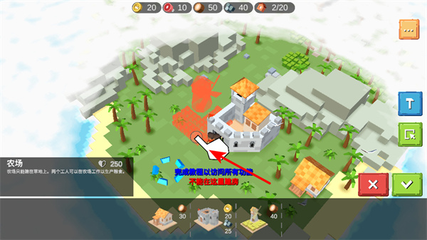 2、放置建筑时,按照提示拖放建筑到合适区域,完成放置后可解锁建筑的功能,如农场可生产粮食资源,助力岛屿的生存和发展。