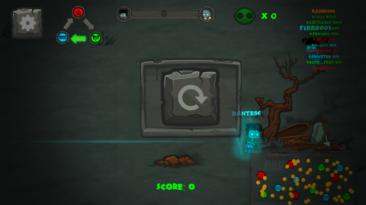 3、遇到其他颜色僵尸如红色僵尸,操控角色攻击对方,获取分数。