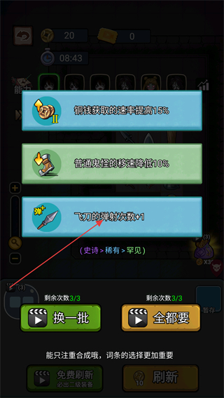 4、玩家每撑过一段时间都会获得一次选择能力的机会,选择需要的能力进行提升。