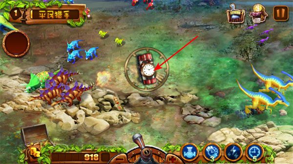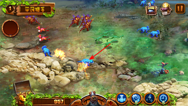 2、发起攻击,向目标恐龙发起攻击,造成伤害并消灭恐龙,同时来进行获取分数。
