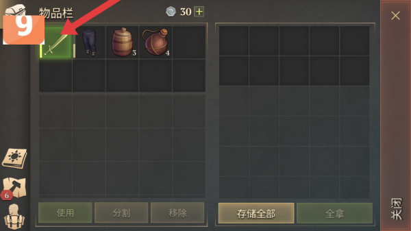 3、在物品栏中,点击箭头指向的武器,可装备该武器,提升自身战斗能力,在遭遇危险生物时,能更好地进行自卫与反击。