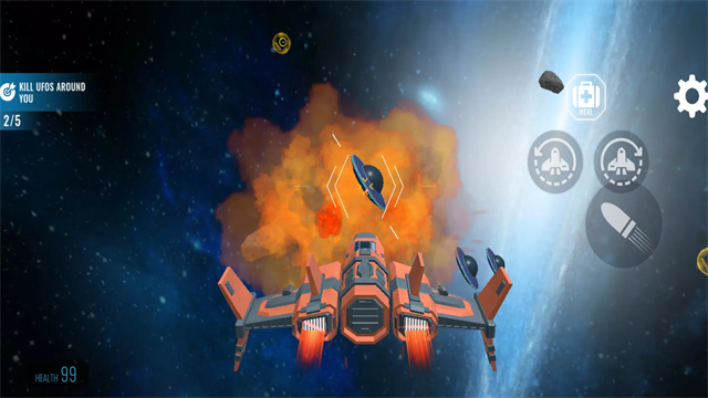 2、射击模式战斗:开启射击模式后,选择适配的武器装备,进入指定太空或星系地图,通过第一人称视角锁定机器人目标,利用精准射击击败敌人。