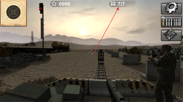 1、观察右上角弹药数量如7/7,确认当前弹药状态,准备射击。