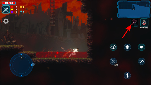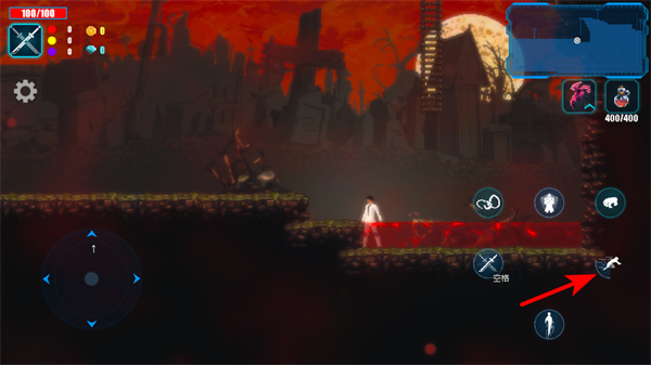 3、点击位移类技能按钮,这是跨越地形障碍的核心操作,使用后可让角色快速移动到高处平台,避开地面的危险区域,继续向目标前进。