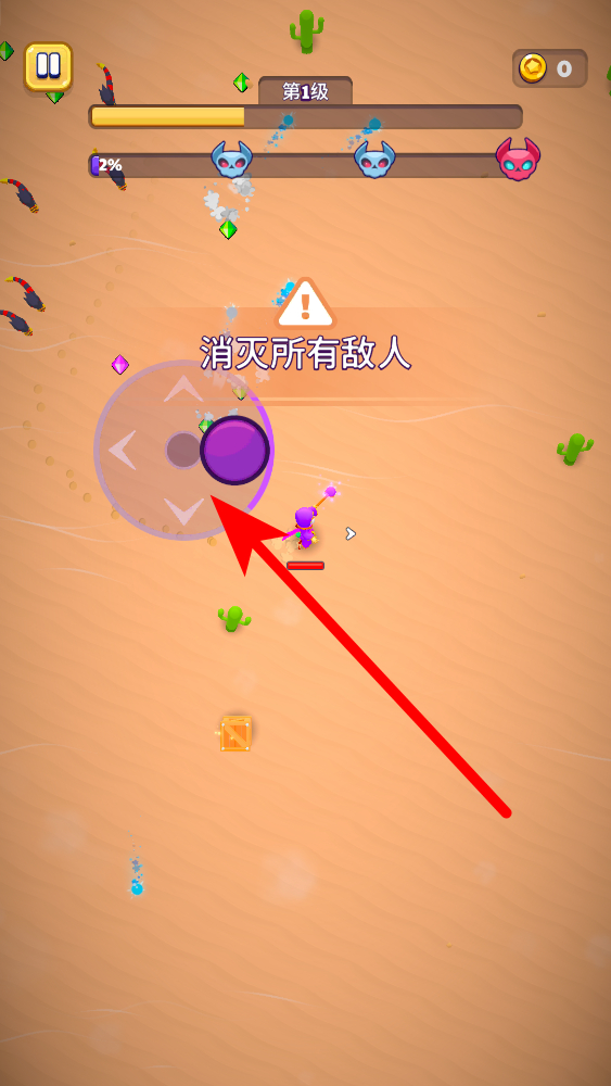1、新人要进行移动操作,在沙漠场通过界面上的方向按钮,操控角色灵活移动,前往不同的区域,探索场景内的各类元素,为后续行动创造条件。