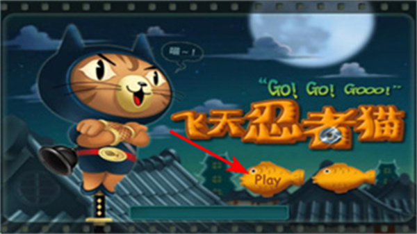 1、在游戏的启动界面,点击Play按钮进入游戏关卡,开启飞天忍者猫的闯关挑战,同时可查看界面显示的角色与主题元素。
