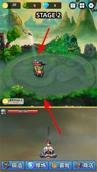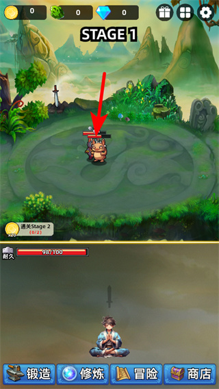 4、击败首个妖怪后,场景将自动切换到STAGE2,点击红色箭头指向的新妖怪目标,继续使用铜剑攻击,并积累更多资源。