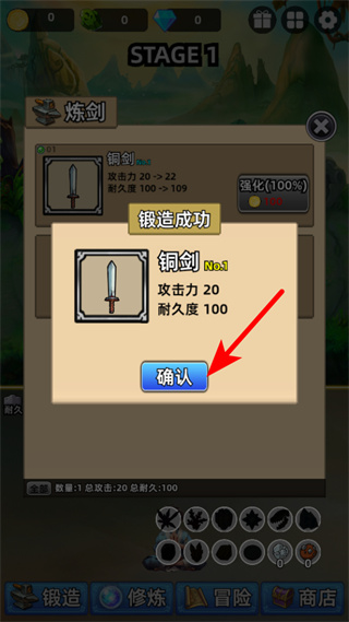 1、在炼剑界面完成铜剑锻造后,点击红色箭头指向的确认按钮,关闭锻造成功的提示弹窗,继续推进游戏流程。