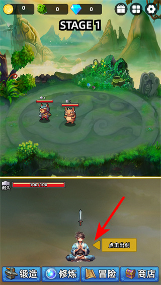 2、回到主场景后,点击红色箭头指向的点击出剑按钮,操控角色使用刚锻造的铜剑,触发与妖怪的战斗环节。