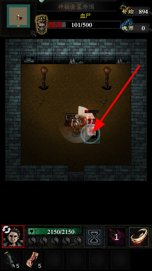 4、遇到敌人如血尸时,通过操作角色攻击敌人,消耗敌人血量,成功击败敌人,可获得补给等奖励,继续古墓冒险。