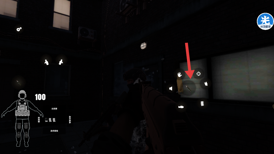 1、进入幽暗的巷战场景后,跟随箭头指向,查看右侧的功能按钮键,熟悉作战的按键,对后续作战有帮助。