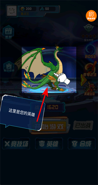 1、进入游戏后点击英雄如绿色巨龙可查看其属性和技能,了解英雄的战力情况,助力后续战斗策略制定。