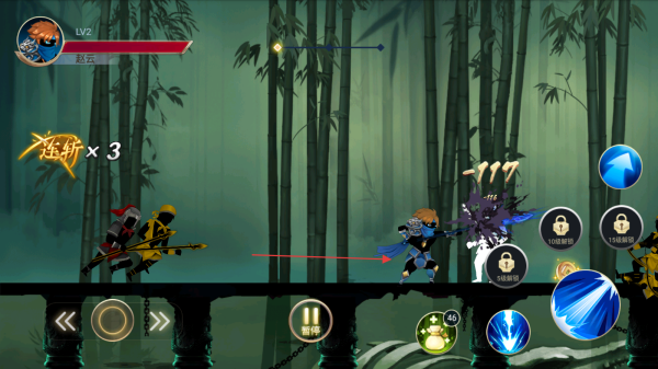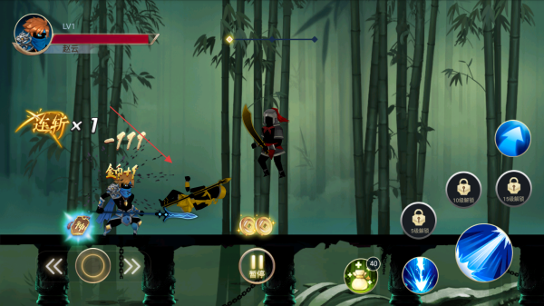 1、操控赵云进入竹林关卡,留意自身Lv1等级和血量条,利用普攻按钮攻击前方白色敌人。