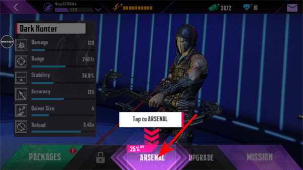 4、在角色界面,点击ARSENAL按钮进入武器库,查看当前武器如Dark Hunter的属性,后续通过升级功能强化武器的伤害、射程等参数。