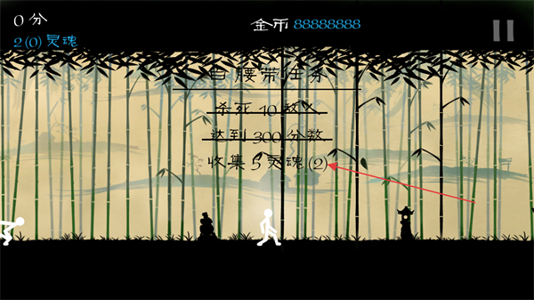 1、进入该界面后,查看白腰带任务涵盖的击杀10只敌人、达到300分数、收集5灵魂目标,操控角色推进以完成这些任务。