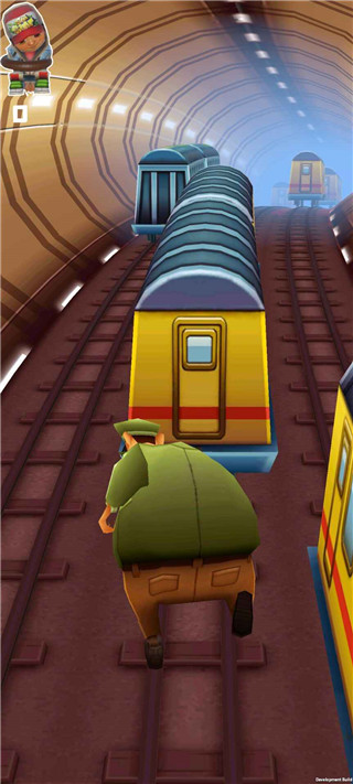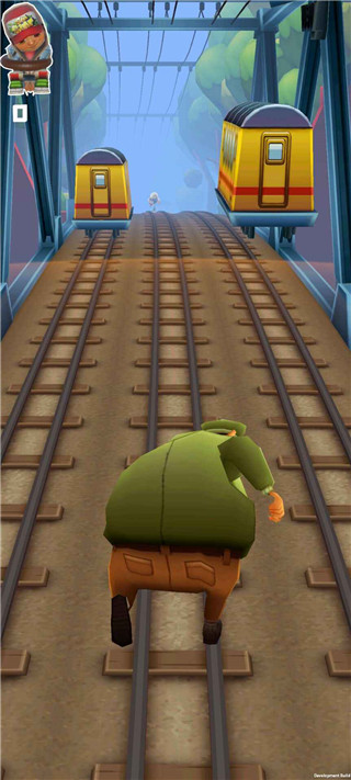 1、游戏开始,操控角色在铁轨上奔跑,滑动屏幕躲避前方的火车和障碍物。