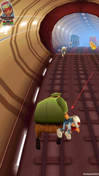 3、看到轨道上的金币,调整角色位置去收集,积累更多分数。