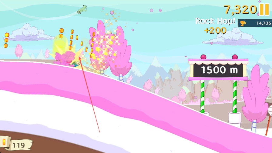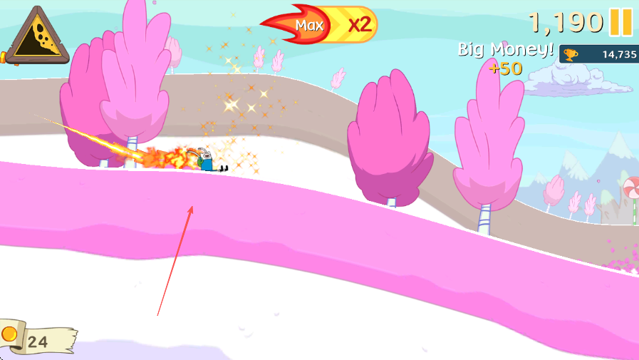 1、游戏开始后,操控角色在粉色的滑雪地形上滑行,躲避障碍物,如树木。