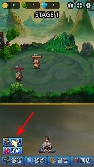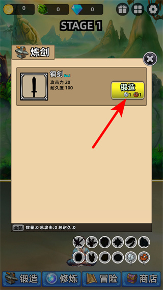4、在炼剑界面中,点击红色箭头指向的锻造按钮,消耗初始资源打造铜剑,获取第一把武器,提升角色的攻击力属性。