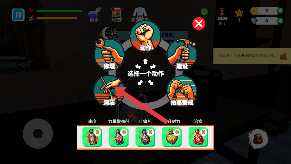 2、游戏中需阅读从门下滑进来的便条并拿走钱,推进剧情的关键操作,通过完成该任务可积累财富。
