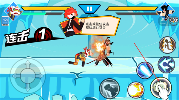 3、当靠近敌方角色后按照提示点击或按住攻击按钮进行攻击,操作攻击按钮对敌方发起攻击,可触发连击提升战斗效果。