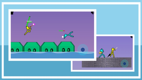 2、把握时机点击跳跃按钮让蓝色火柴人跳起躲避攻击、找准落点后再次进攻敌人。