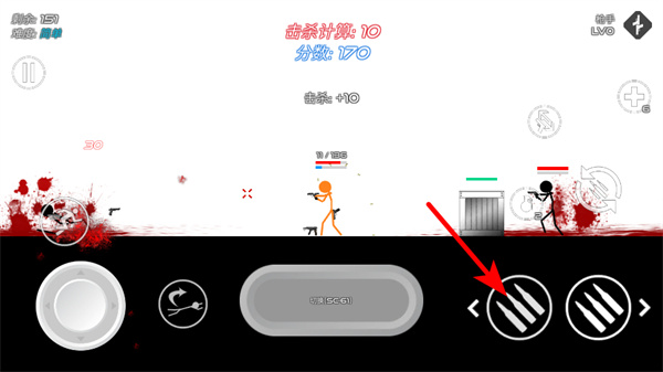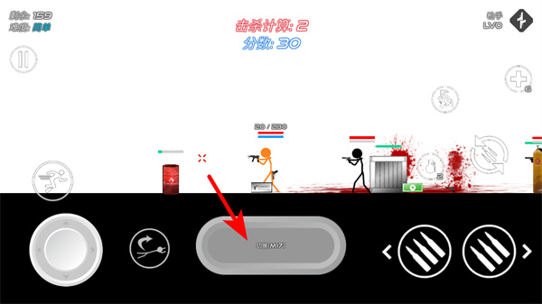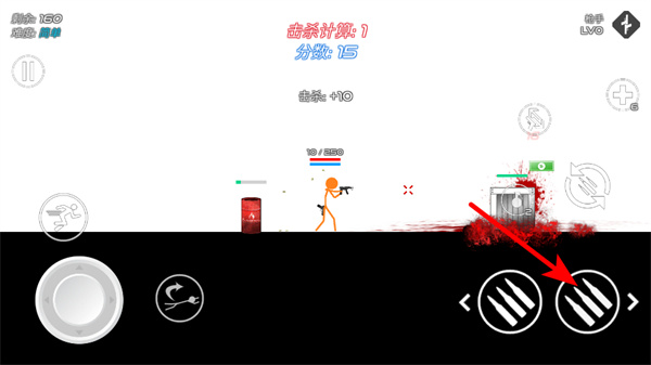 2、进入关卡后,通过右侧的射击按键对敌方火柴人发起攻击,每击倒一个敌人会提升击杀计数与分数,同时留意场景里的红色油桶,利用其爆炸效果范围伤敌。