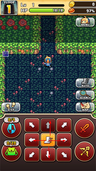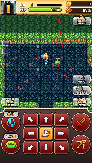 1、操控角色在地牢场景中四向移动,探索地图,收集道具和资源。