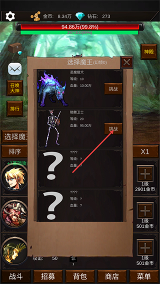3、在选择魔王幻境面板中,选定骷髅卫士后点击对应的挑战按钮,即可开启与该魔物的战斗挑战获取对应奖励。