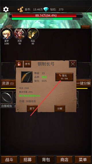 4、在背包界面打开钢制长弓的详情面板后,点击面板中的强化按钮,消耗强化石提升该装备属性增强角色战力。