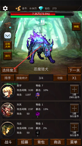 2、在战斗界面点击选择魔王按钮,打开魔物选择面板选定对应的魔物后,可搭配角色开启当前关卡的战斗进程。