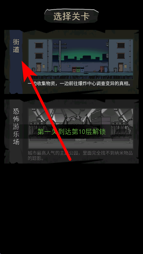 2、来到关卡选择界面,初始可选择街道关卡,在该关卡中,要一边收集物资,一边朝着爆炸中心前进,调查变异的真相。