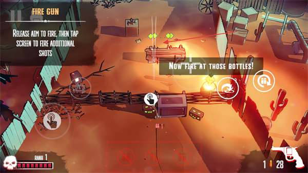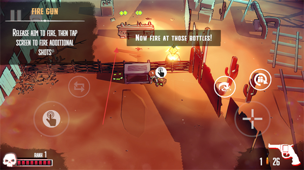 4、持续按操作开火射击瓶子,完成当前射击任务,推进关卡进度。