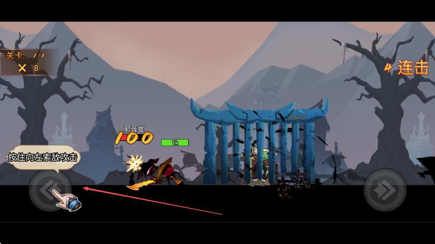1、进入游戏,根据提示按住向左索敌攻击,点击屏幕左侧方向按钮对敌人邪骨草发动攻击。