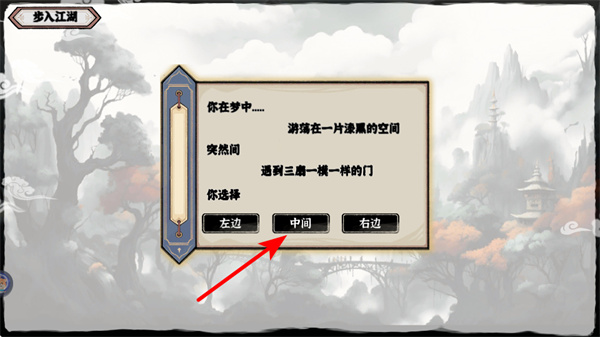 1、在游戏中,选择中间门开启江湖旅程,门的选择是确立初始路线的关键操作,选择后可进入对应的剧情分支,开启不同武侠人生。