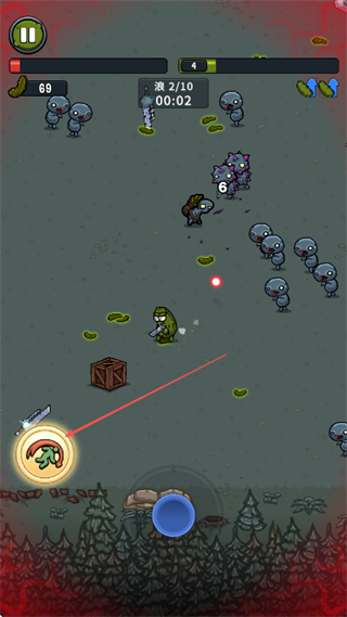 2、操控泡菜皮特移动,自动发射武器攻击灰色小怪,收集掉落的道具和资源。