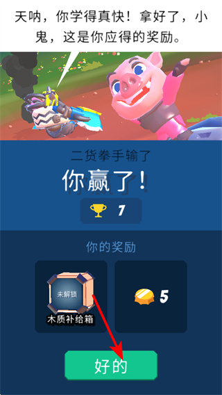 3、战斗胜利后点击好的按钮领取奖励,奖励领取是积累资源的关键环节,领取后可获得金币和补给箱,角色强化道具解锁。