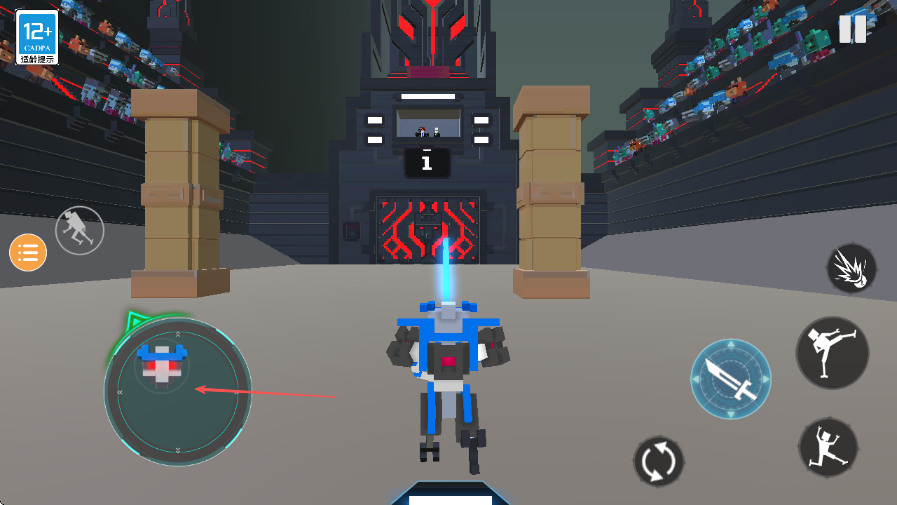 2、到达角斗场后,通过屏幕左侧的虚拟摇杆控制机器人移动方向,确保能观察到周围环境和敌人位置。