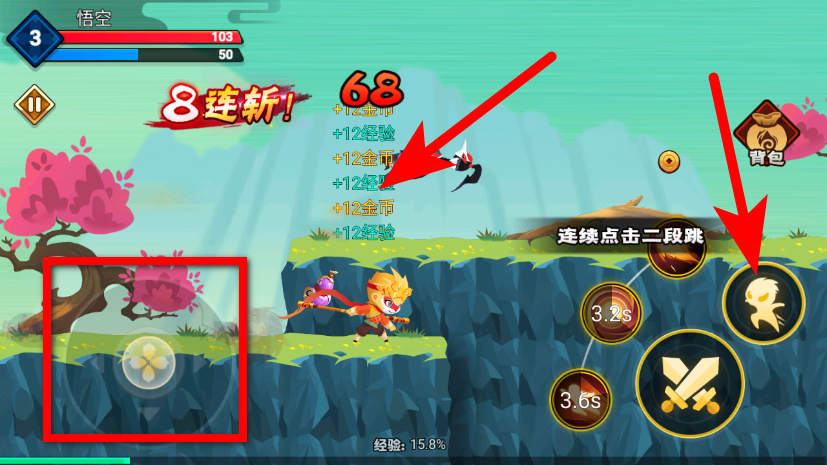 4、后续关卡中,操作移动键跨越地形,连续点击实现二段跳,灵活作战。