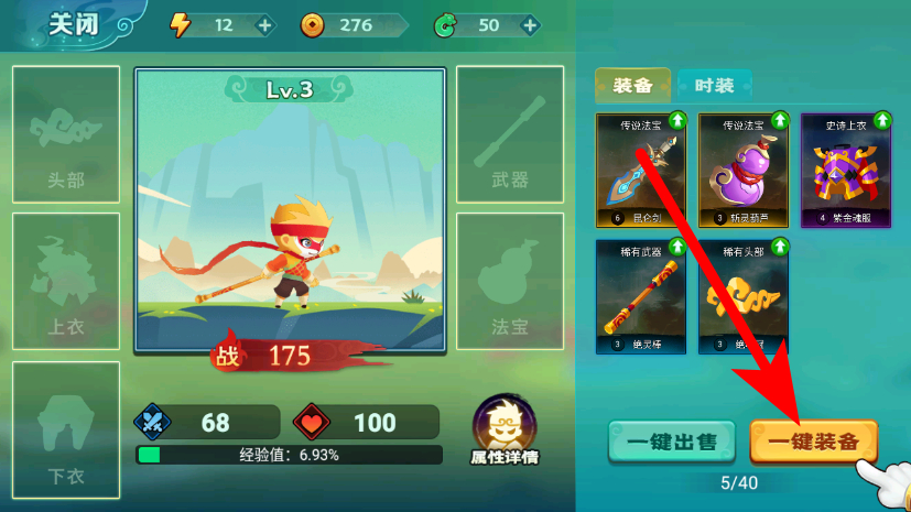3、在背包中点击一键装备,穿戴新获得的装备提升角色战力。