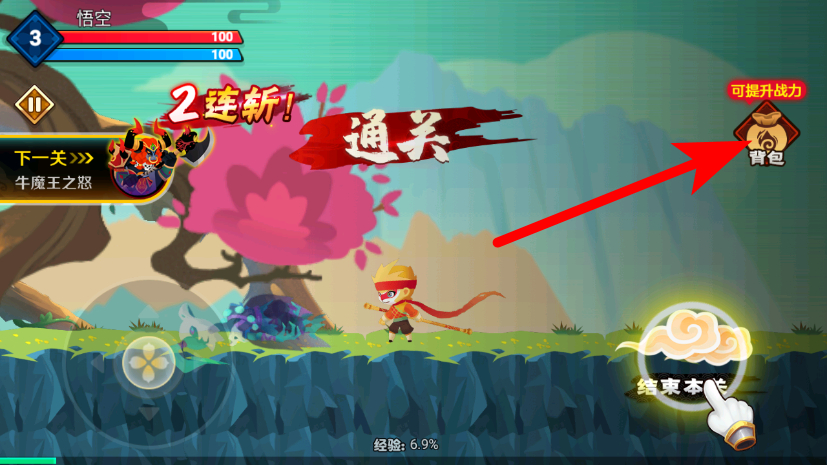2、通关当前关卡后,点击结束本轮,点击进入背包界面准备强化角色。