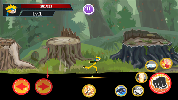 1、通过左下角的红色左右方向键控制火柴人角色移动,在森林场景中探索前进。