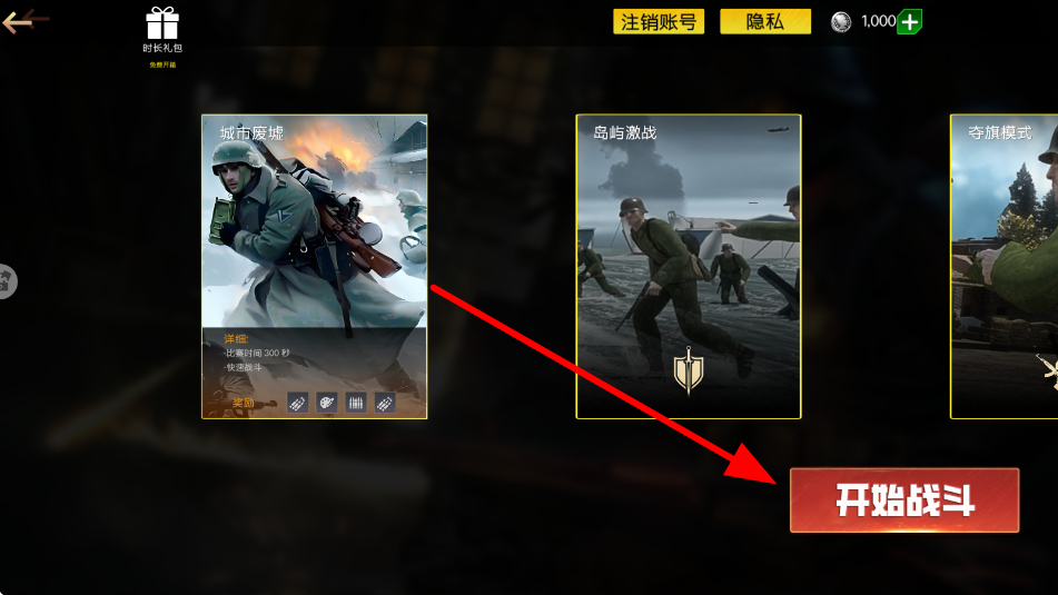 2、选择好武器后,挑选喜欢的战斗模式,比如城市废墟、岛屿激战等,然后点击开始战斗,进入相应的战场。